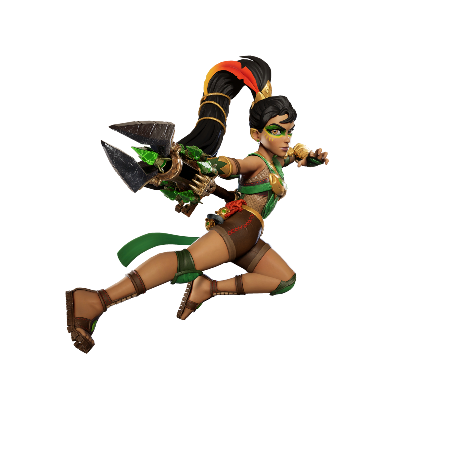 A warning to those who enter the jungle harboring any sense of superiority: you dismiss the indigenous population as “primitive” at your peril. Exhibit A: Izell is a fierce warrior, unmatched in hand-to-hand combat, who uses a Jaaqua-inspired martial arts style developed by her forebears. The Spear she carries is no mere pointy stick, it is a weapon that launches a variety of munitions – SPEAR ROCKETS, obviously, but also the BOLA SNARE, which ensnare her opponents and drags them toward her, so she can then unleash her JAAQUA CHARGE, a debilitating release of stored Gemstone Energy.