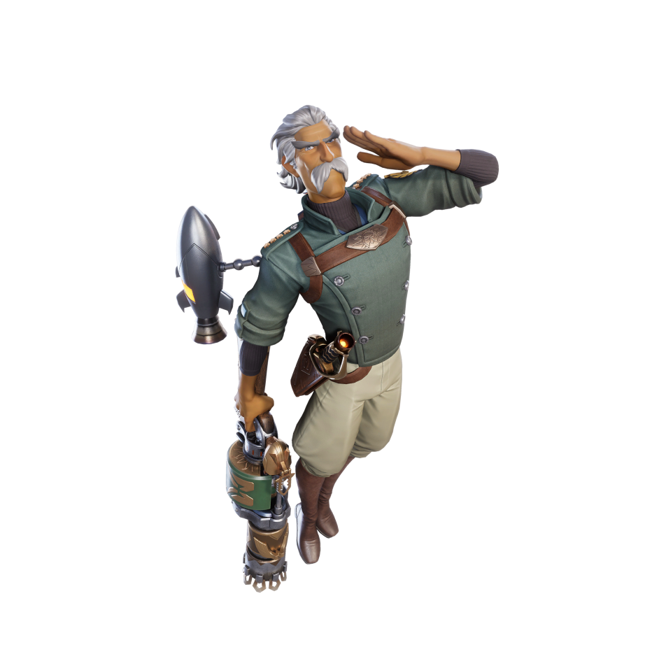 Air Marshal Topnotch has quite the advantage during the games because of the DUAL-ROCKET BACKPACK he wears, which allows him to fly. His primary weapon is the BOUNCING BEAUTY, which skips along the ground in a serpentine manner and will not explode until Topnotch releases his launcher’s trigger. He also utilizes the ARTILLERY SALUTE, which looks like a fireworks display, until it hones in on his foe like a swarm of explosive hornets. Finally, when Topnotch wants to clear a surrounding area, he rockets upwards and smashes down with his SABRE, resulting in a circular blast zone he calls the ZEPHYR STRIKE, after his aerial battleship, THE GOLDEN ZEPHYR.